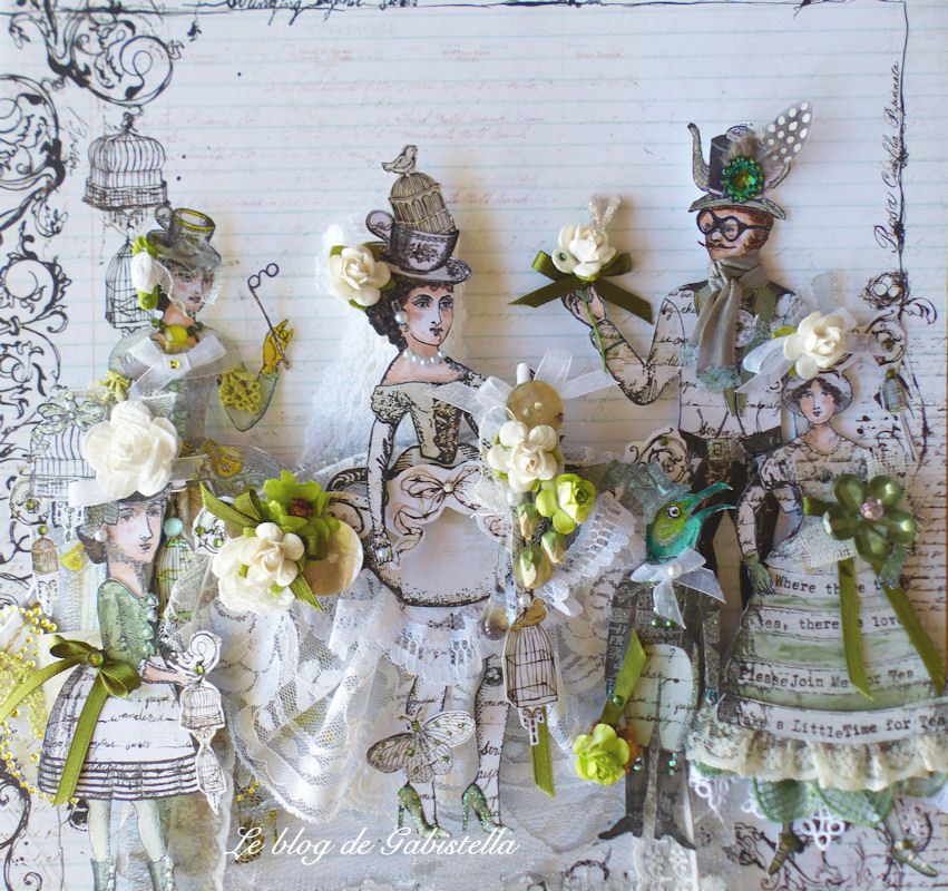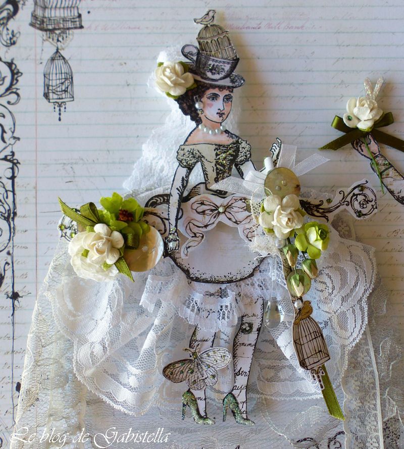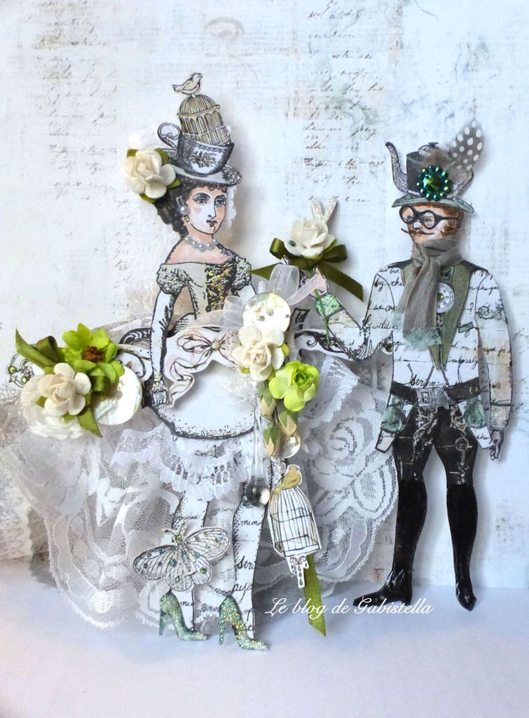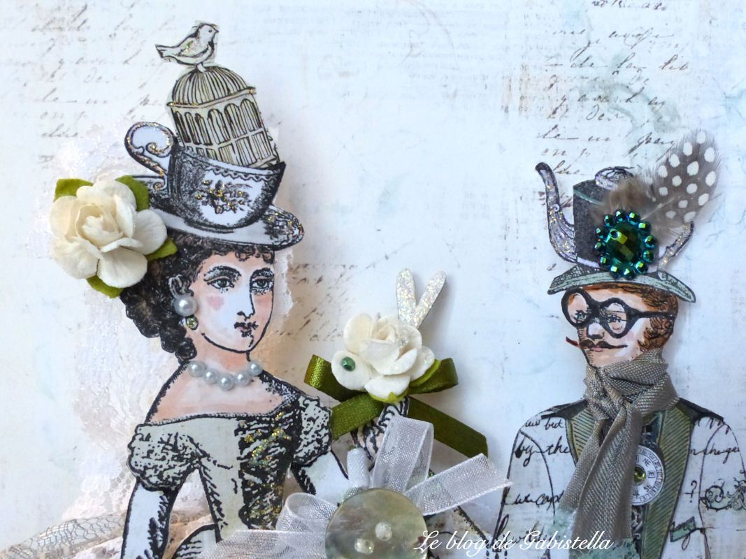 Pour les découpes vêtements, j'ai utilisé la coll. Epiphany (petit format) de Prima. C'est un papier aux motifs romantiques s'accordant parfaitement à mon thème. Les bottes ont été vernies avec du Glossy accents. Il tient à la main une fleur en papier surmontée d'un coeur embossé à chaud. Joli détail pour sa Dulcinée.